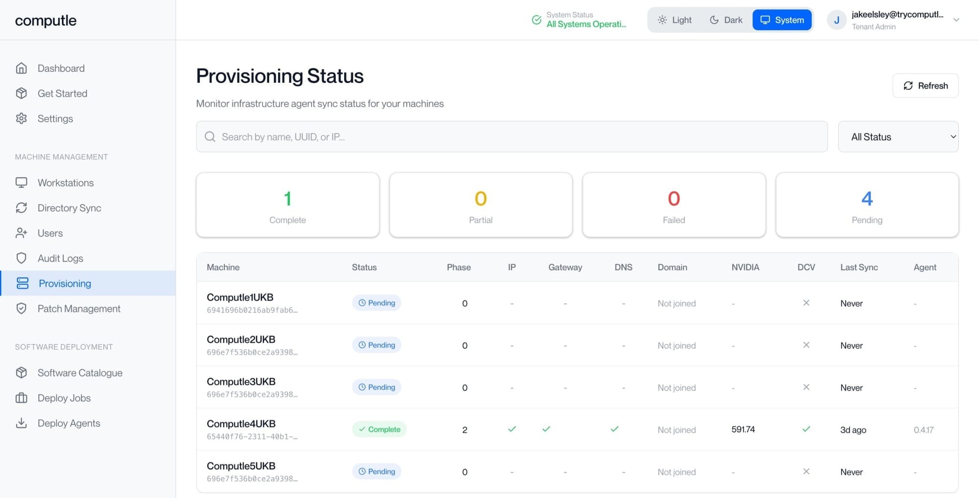 And it doesn't stop after day one. Our provisioning agent runs a nightly check to make sure everything is still configured correctly. If something has drifted, it's automatically corrected. From the portal, you can see every machine's status at a glance — what's complete, what's in progress, and anything that needs attention.