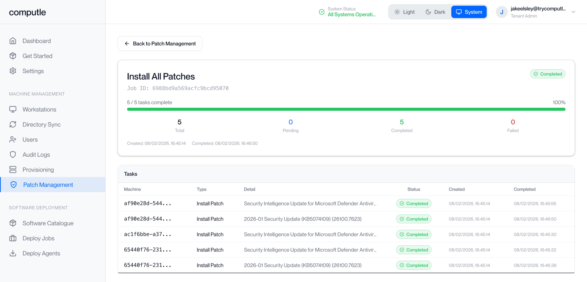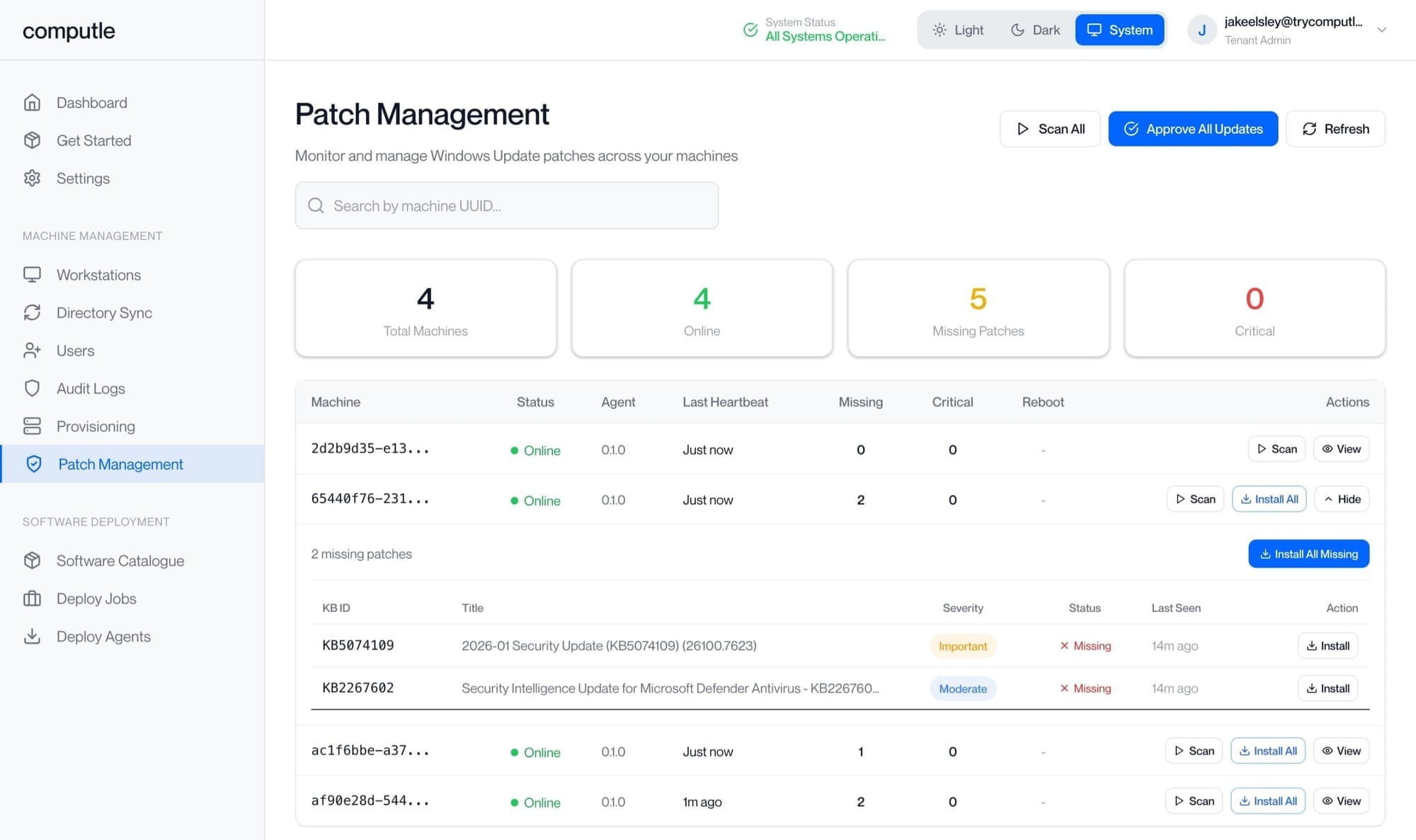 Every Computle workstation scans for available patches and reports back to the platform with the severity rating from Microsoft. You get a clear dashboard showing your entire estate — total machines, what's online, what's missing, and what's critical.