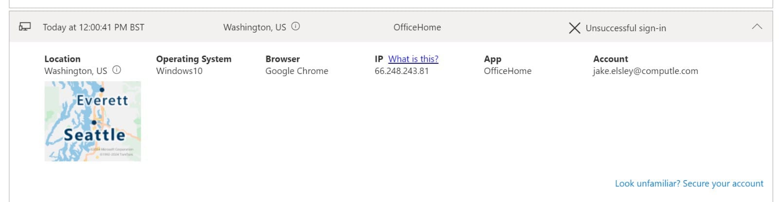 Of course, I provided a dummy password. But as soon as I did, the login was tested from what could be considered a "known location", Washington US. I have long questioned the efficacy of IP or geo-based restrictions, as it is so easy to spoof your actual location. For the M365 known location flag, this most likely would have been deemed a safe location.