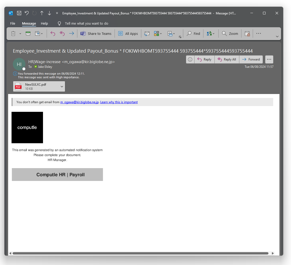 Yesterday, I received an email from HR (me) informing me (the owner) that I was getting a pay rise. Intrigued to see this attack in real life, I played along. This is what I saw.