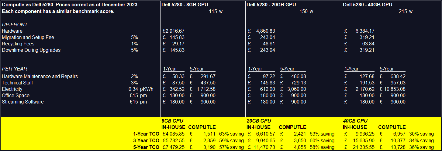 The 20GB GPU configuration sees even more substantial savings. Traditional in-house delivery costs £6.6k for one year and grows to £11.4k over five years. In contrast, Computle's model is priced at £2.4k for the first year and £4.8k for five years.